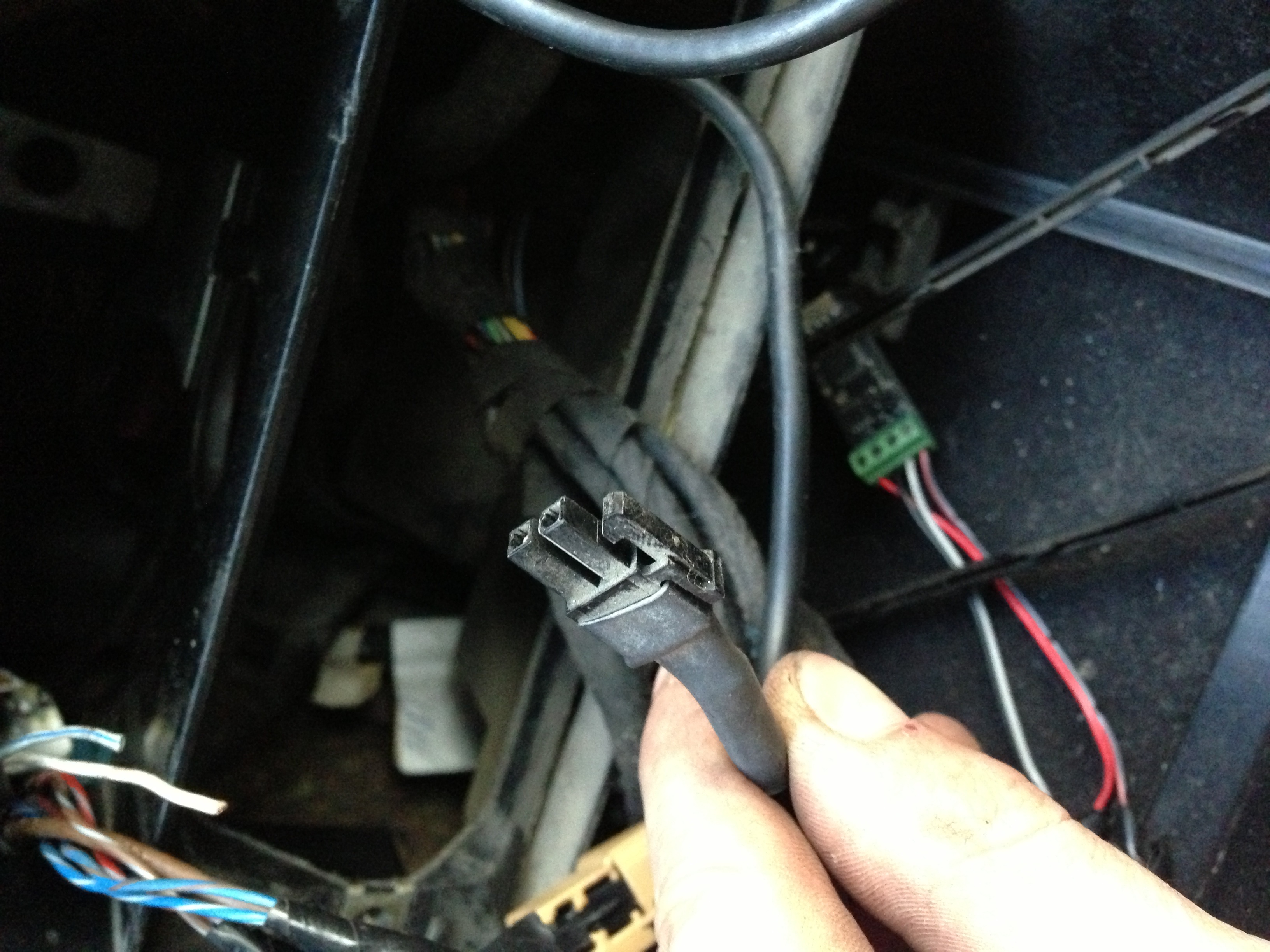 вроде идёт из под ног водителя один плюс другой минус. страно что в такой толстой обмотке. нашёл его в центральной консоли за магнитолой