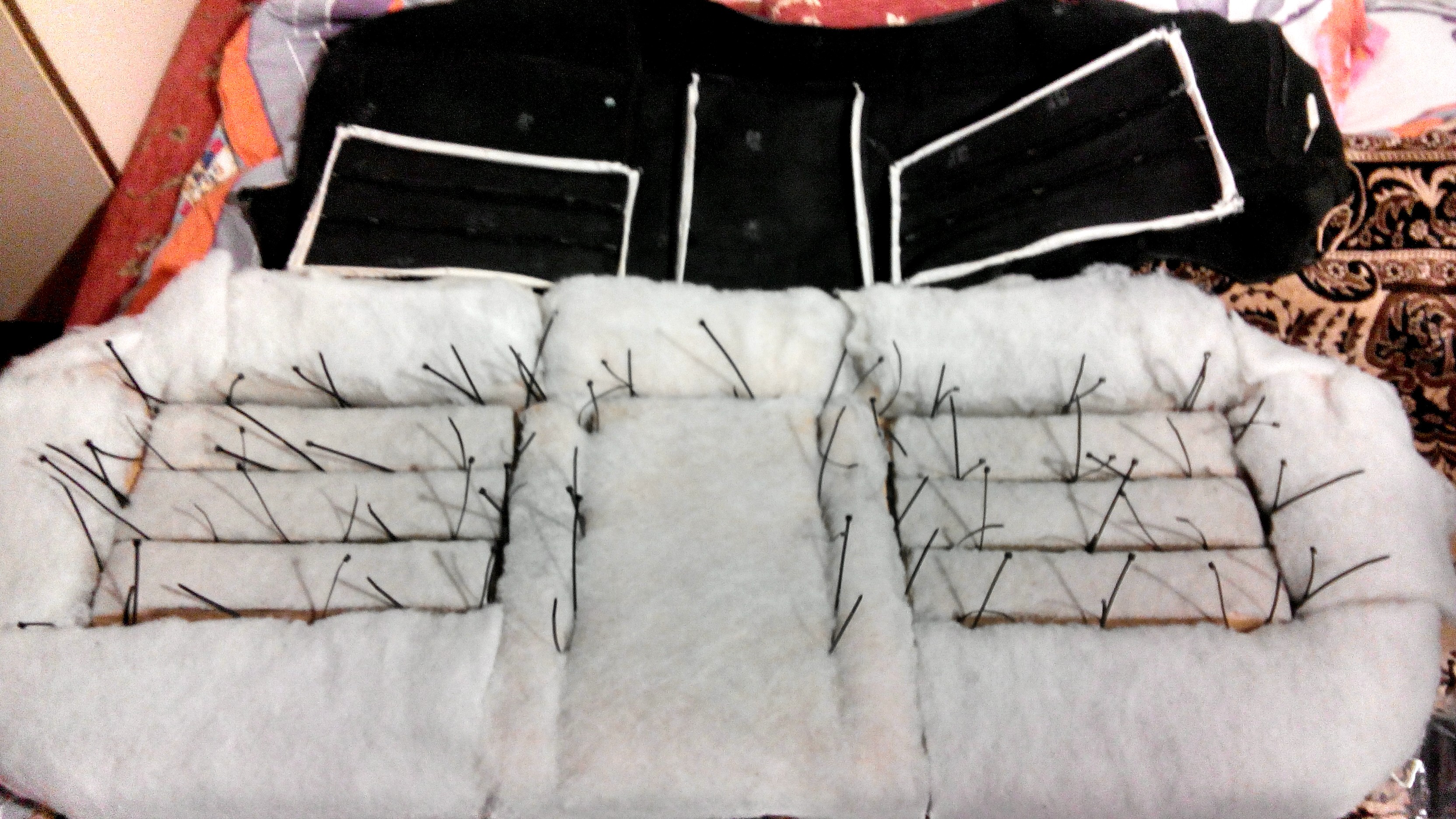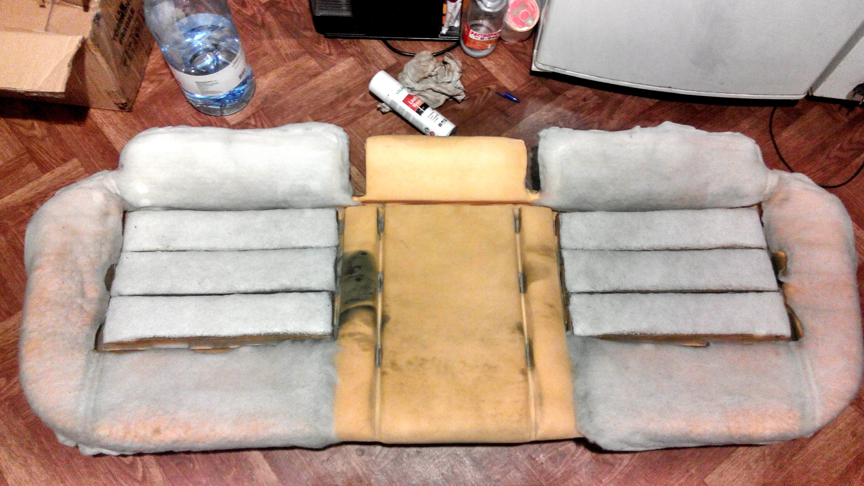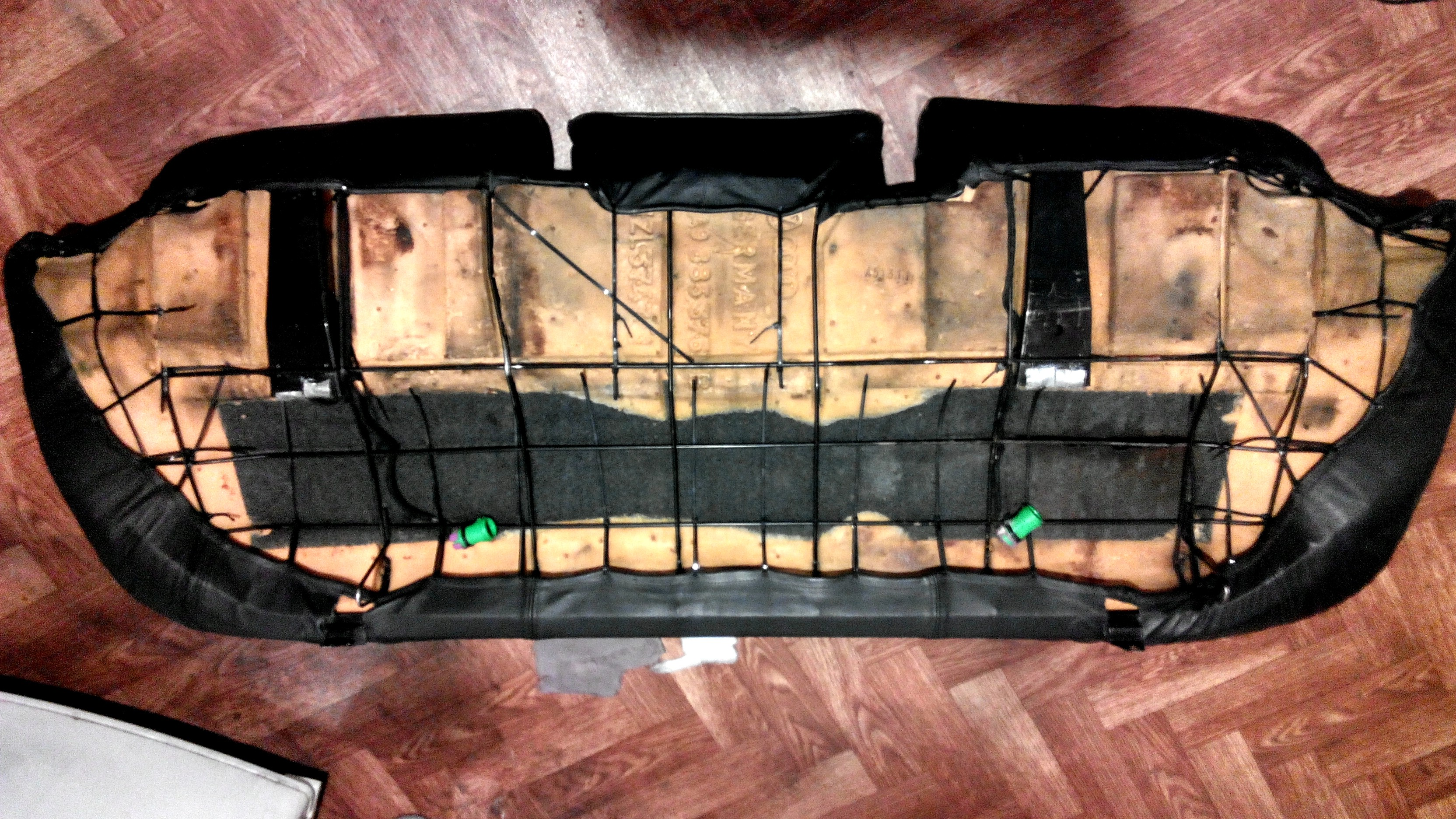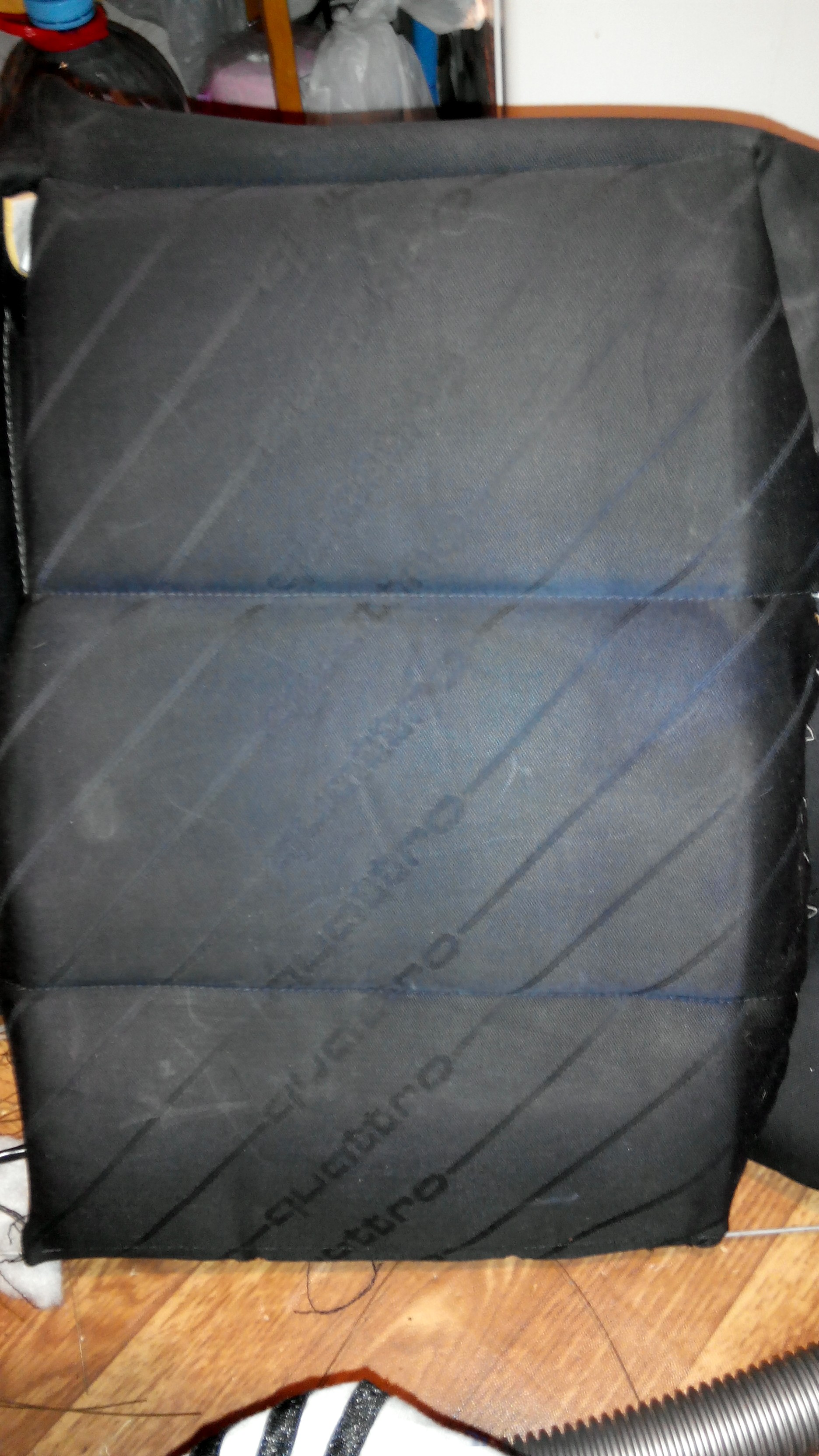 тряпку пришлось натягивать на внутренности из-под кожаных седений, так выглядит после 4-х месяцев жесткого пользования (около 25к км), если правильно перетянуть обшивку и заменить свалявшийся синтепон будет лучше нового, т.к. заводской крепёж на кольцах не даёт хорошего натяжения в сравнении со стяжками, особенно актуально для кожи