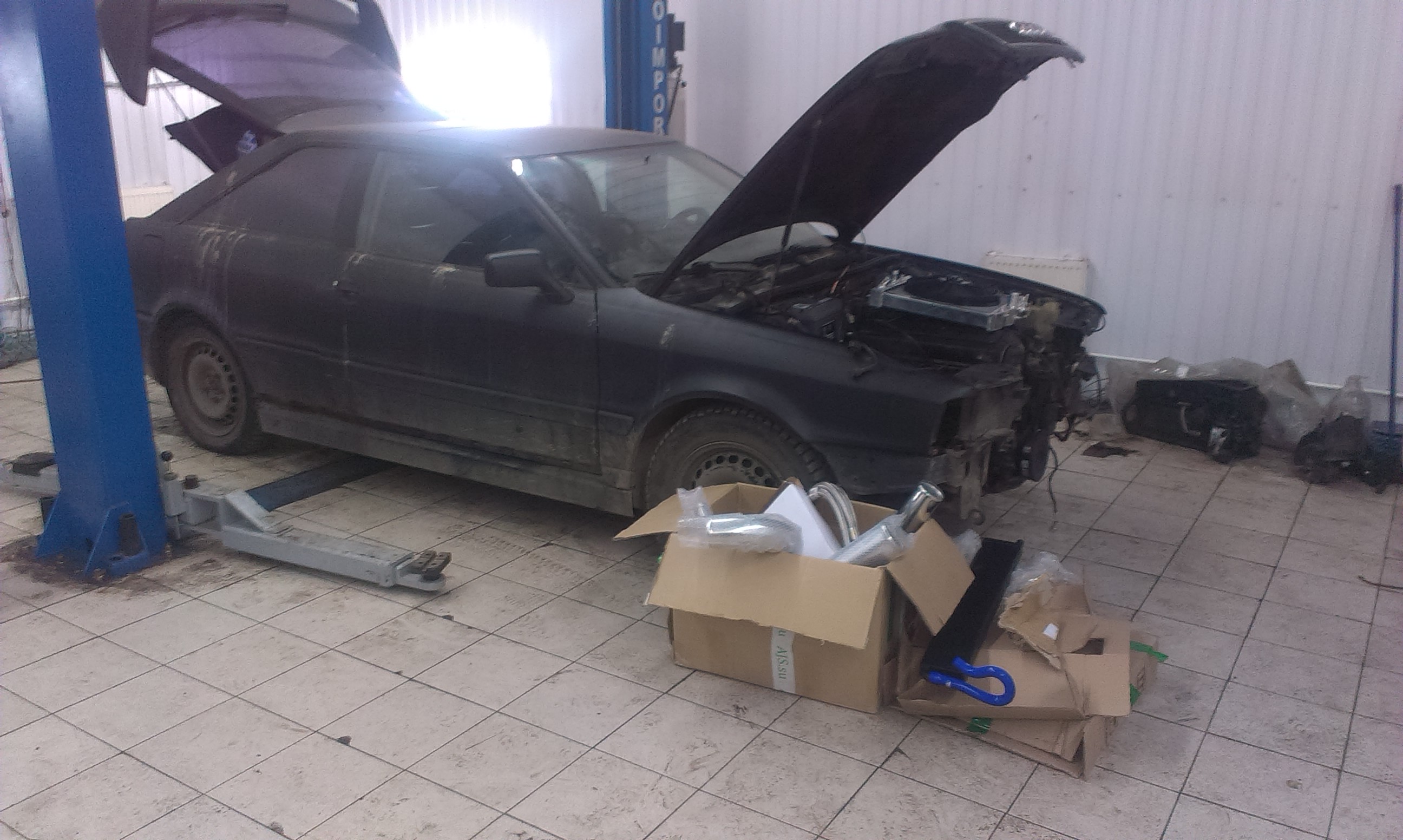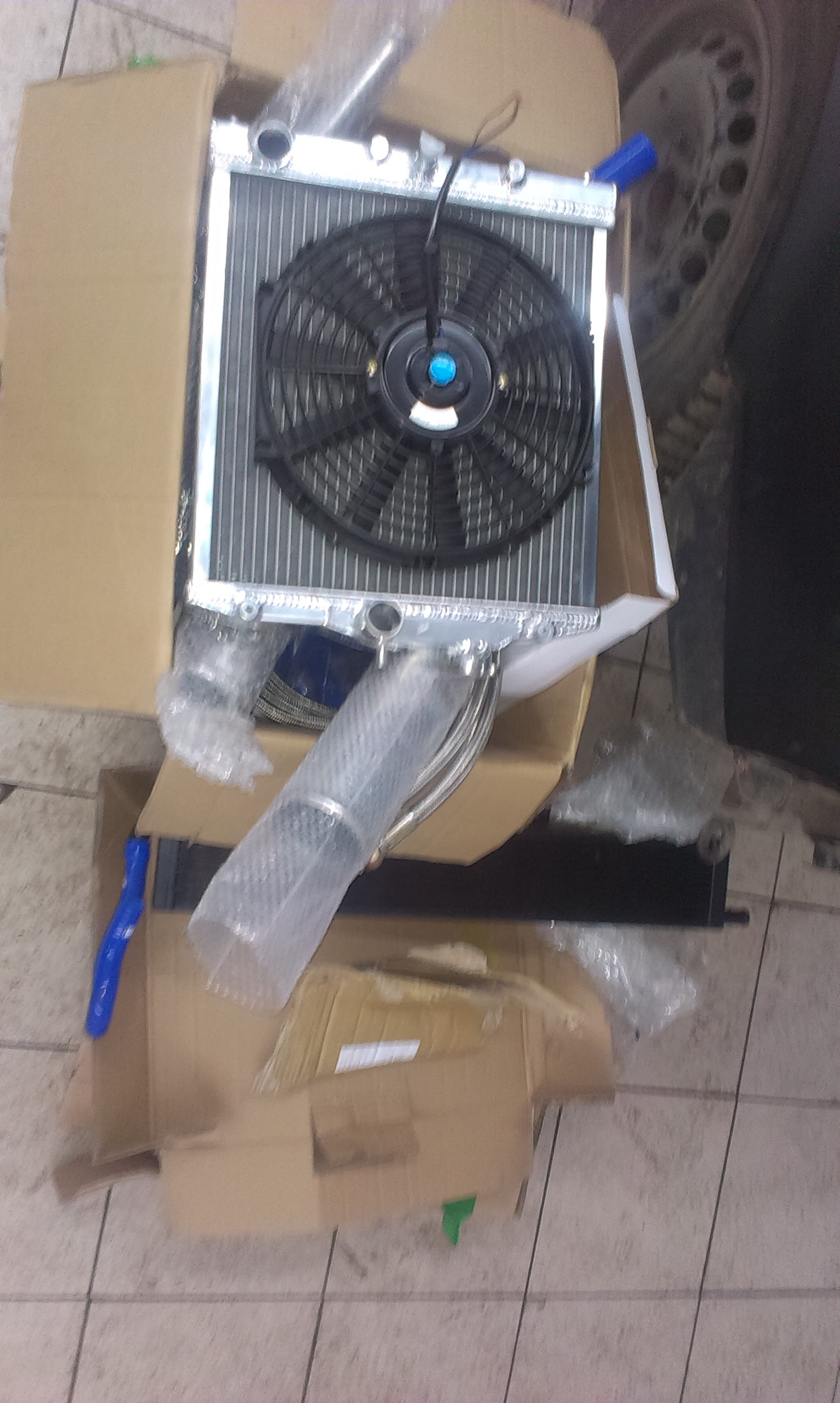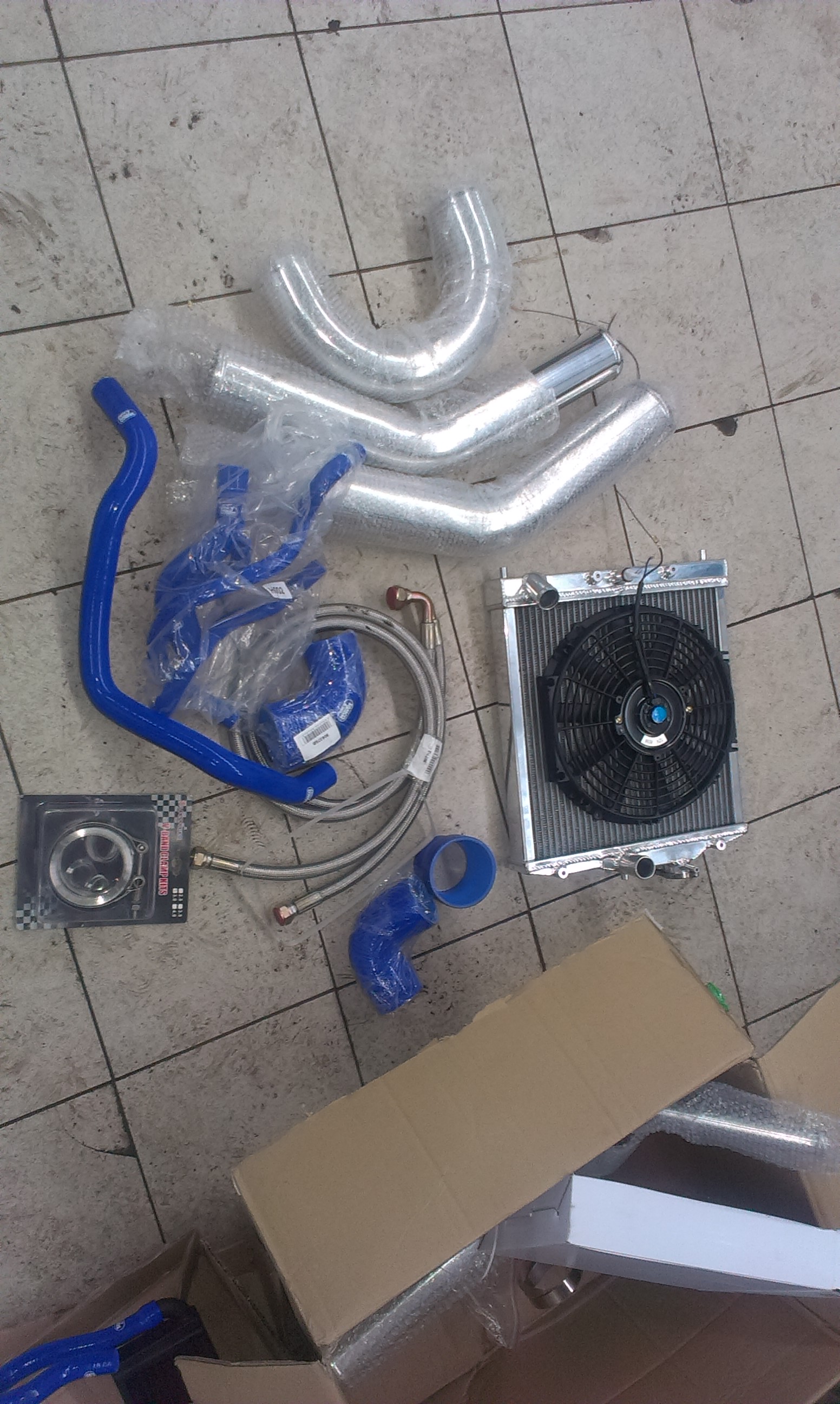 Приехал радиатор,сцуко меньше см на 7 чем родной в высоту,,ебаные китайцы))но толще..будем спереди городить еще радиатор,так же пайпы,шланги на маслокуллер,детали на выхлоп и силикон на охлаждайку и на впуск..