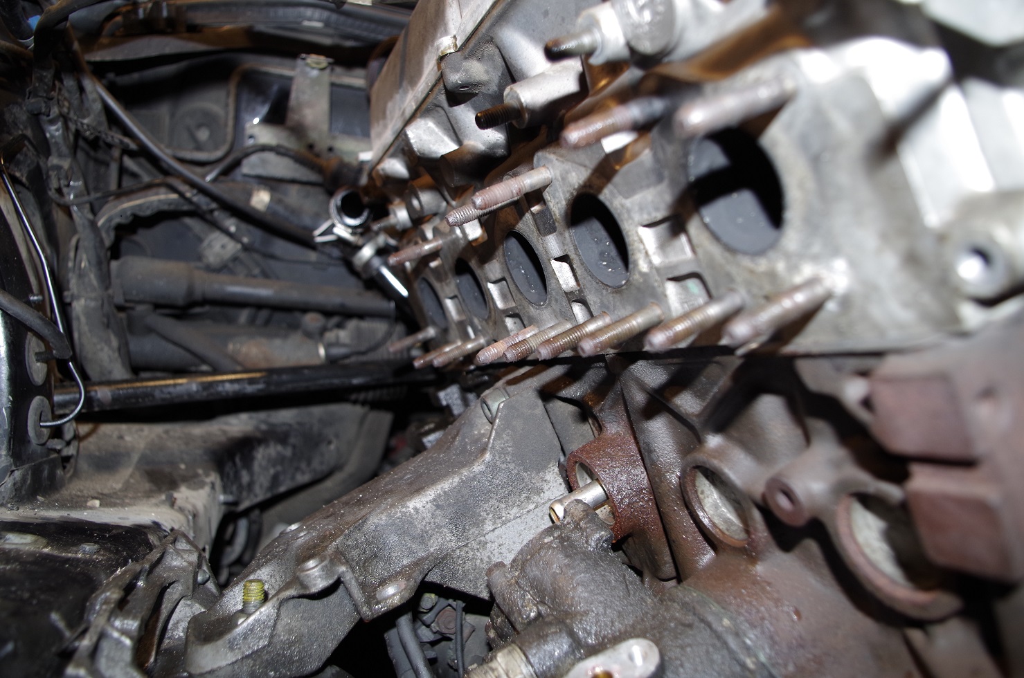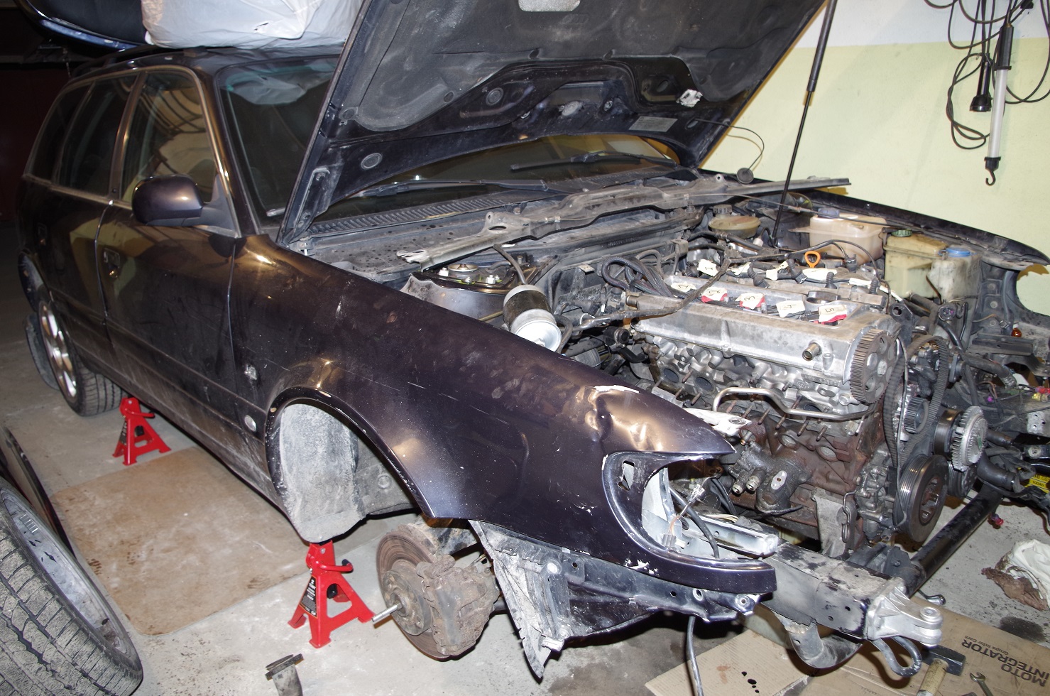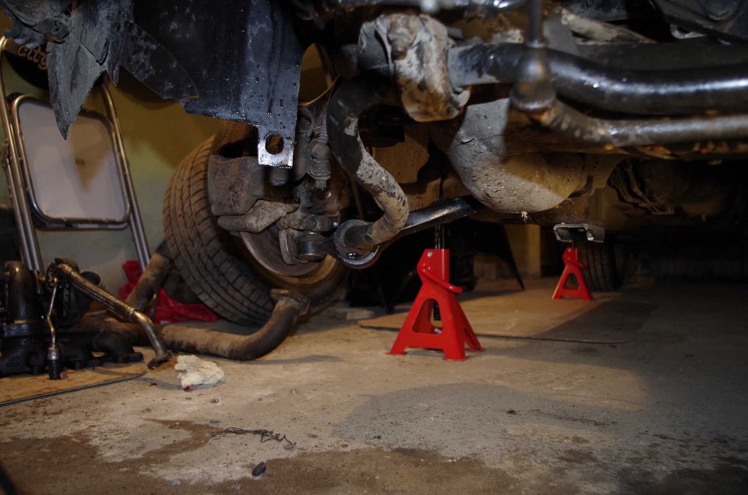 Сегодня наконец-то поставил машину на опоры, снял выпуск, турбу, генератор, ролики, слил масло и так далее.