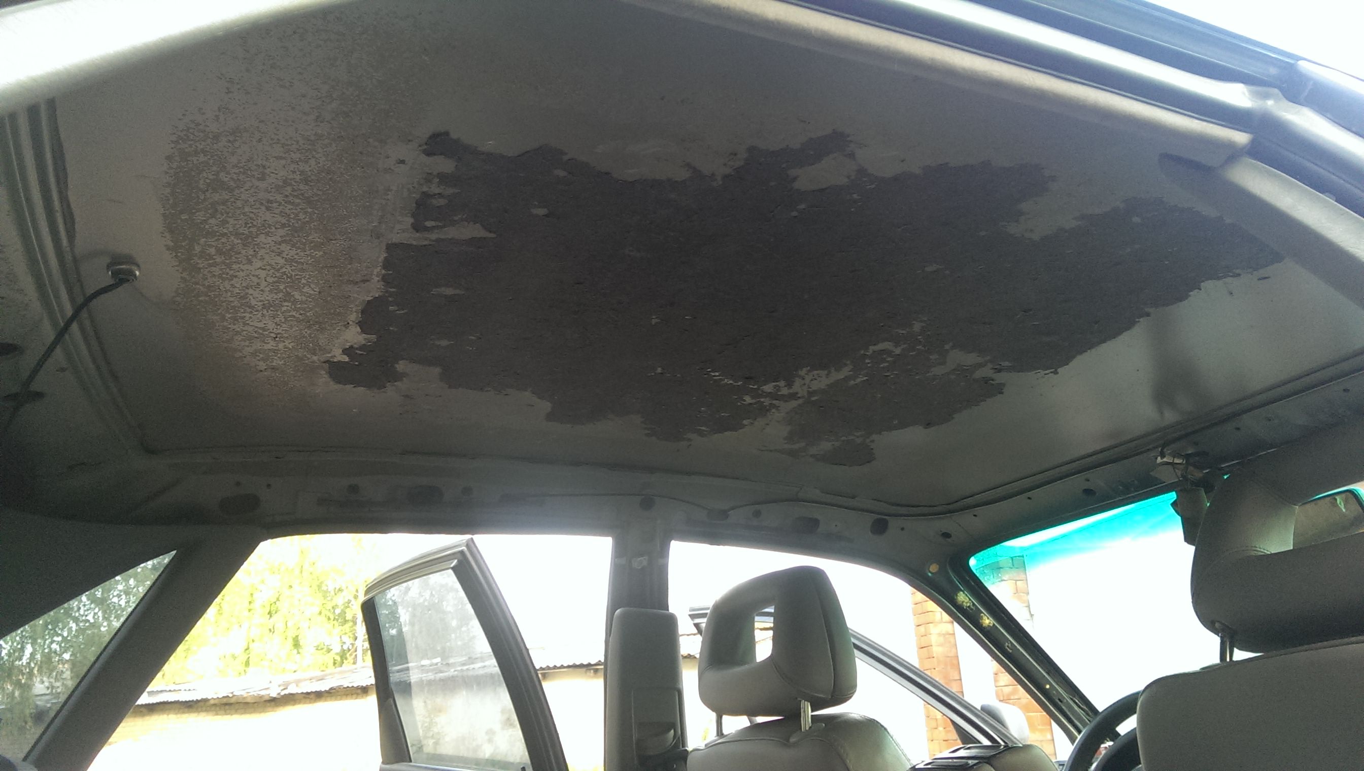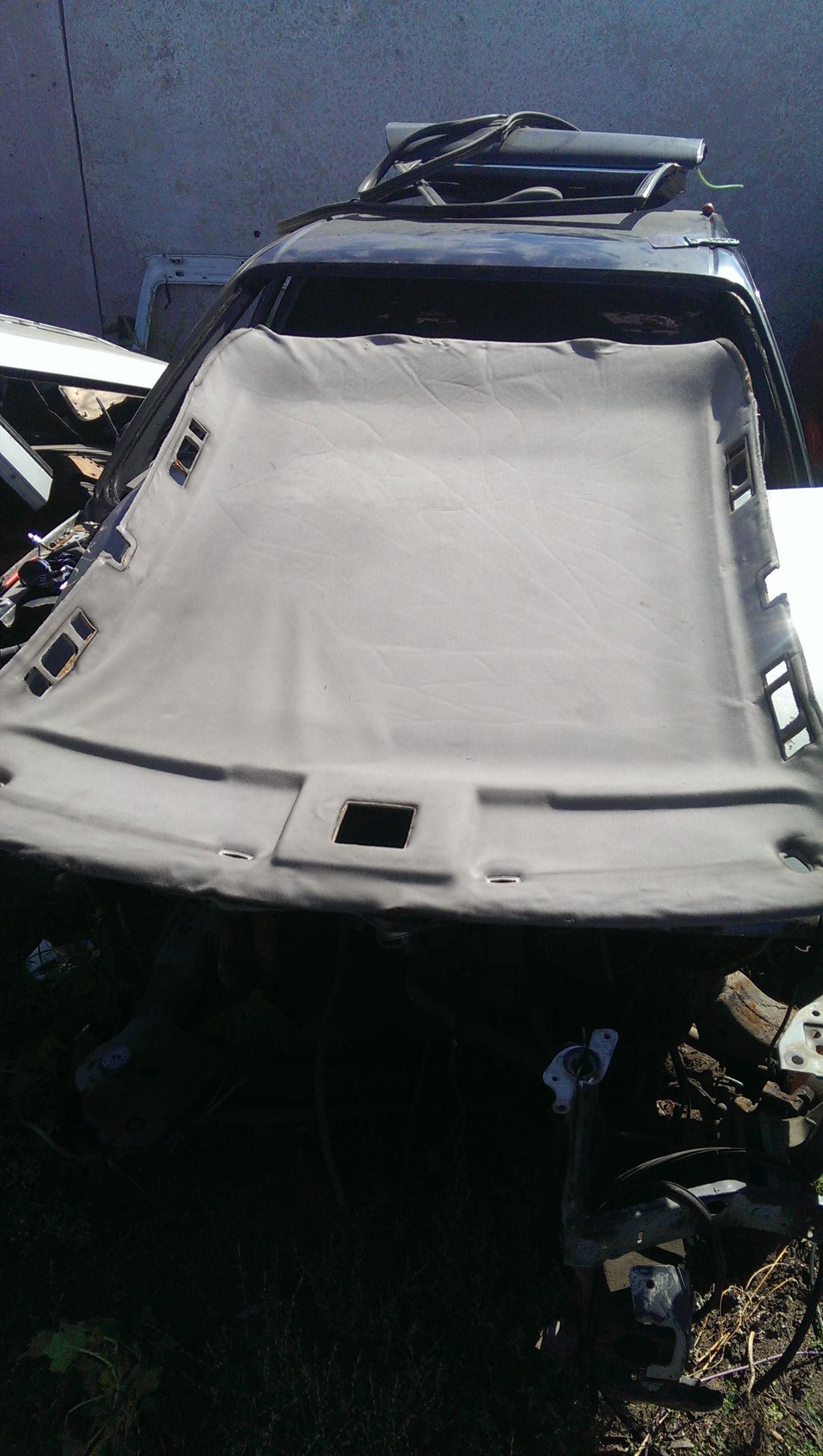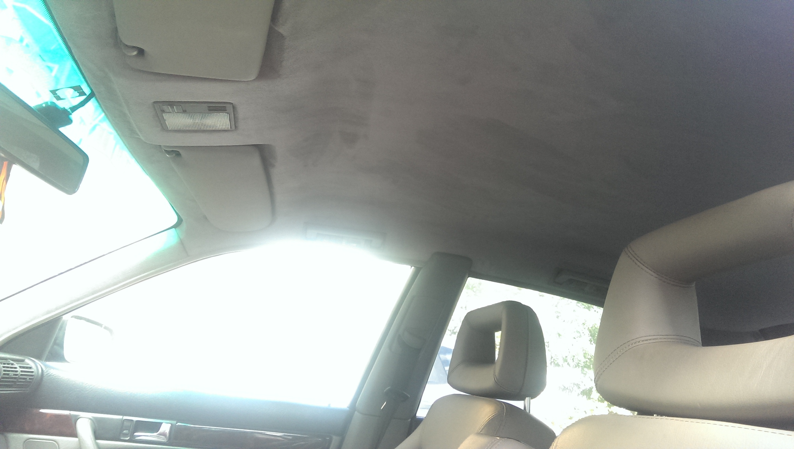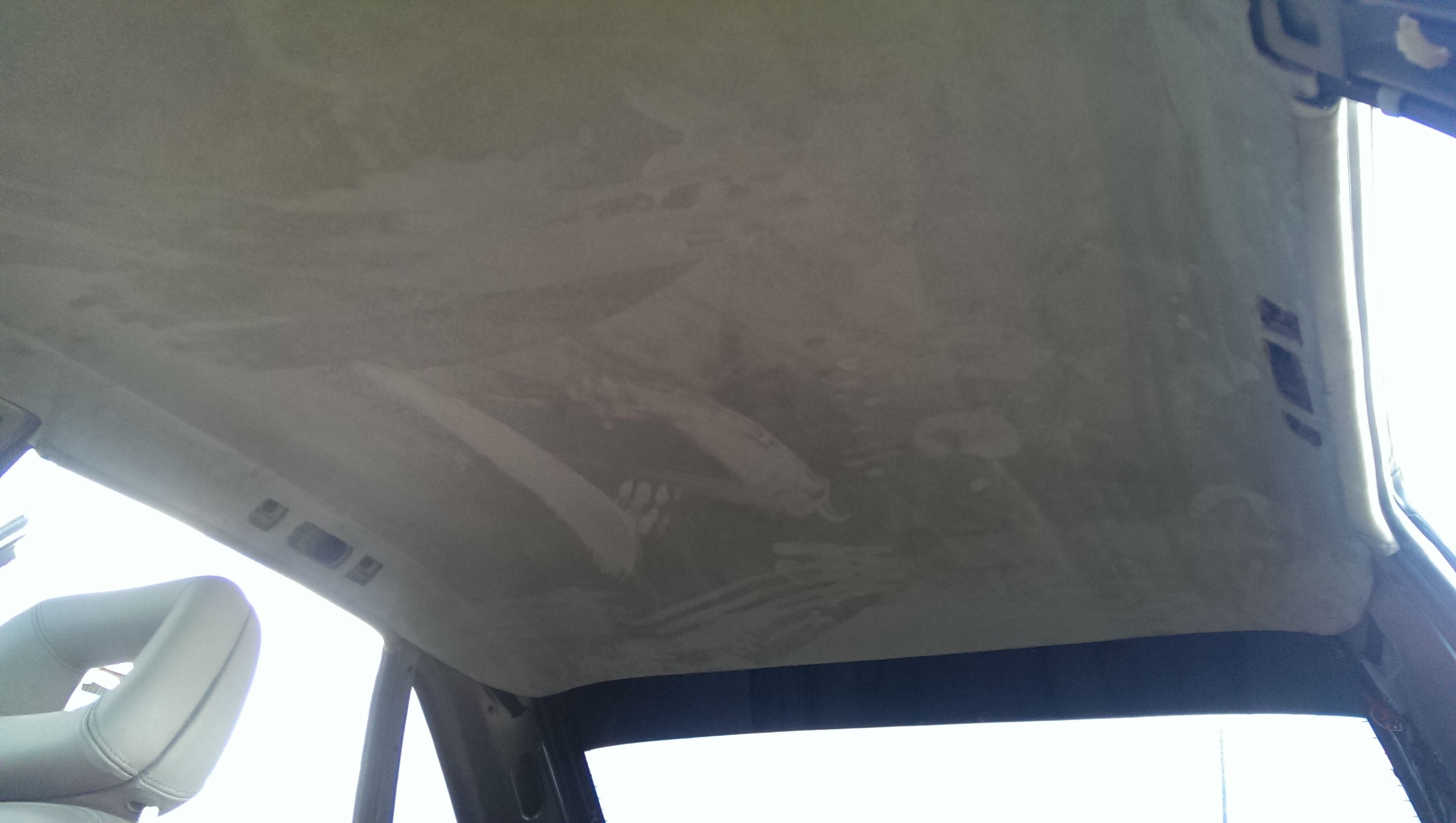 Обновил потолок, точнее обшивку потолка. На прошлой сходке пока многие катались на картингах,от нечего делать -потер потолок пеной для чистки салона. Результат дал о себе знать, хотя его уже чистил, но видно химия бывает разной. Со времянем он все обвисал, и это напрягало! Посмотрев как Саня RVSN перетянул потолок , решил выбрать алькантару. Но не тут то было, родной потолок не хотел отклеиваться(грел феном, брызгал растворителем) и был попросту порван! Снял на разборке с донора , за что отдельное спасибо Пашке AUDI_90. Повезло , что на доноре клей уже был сухой.