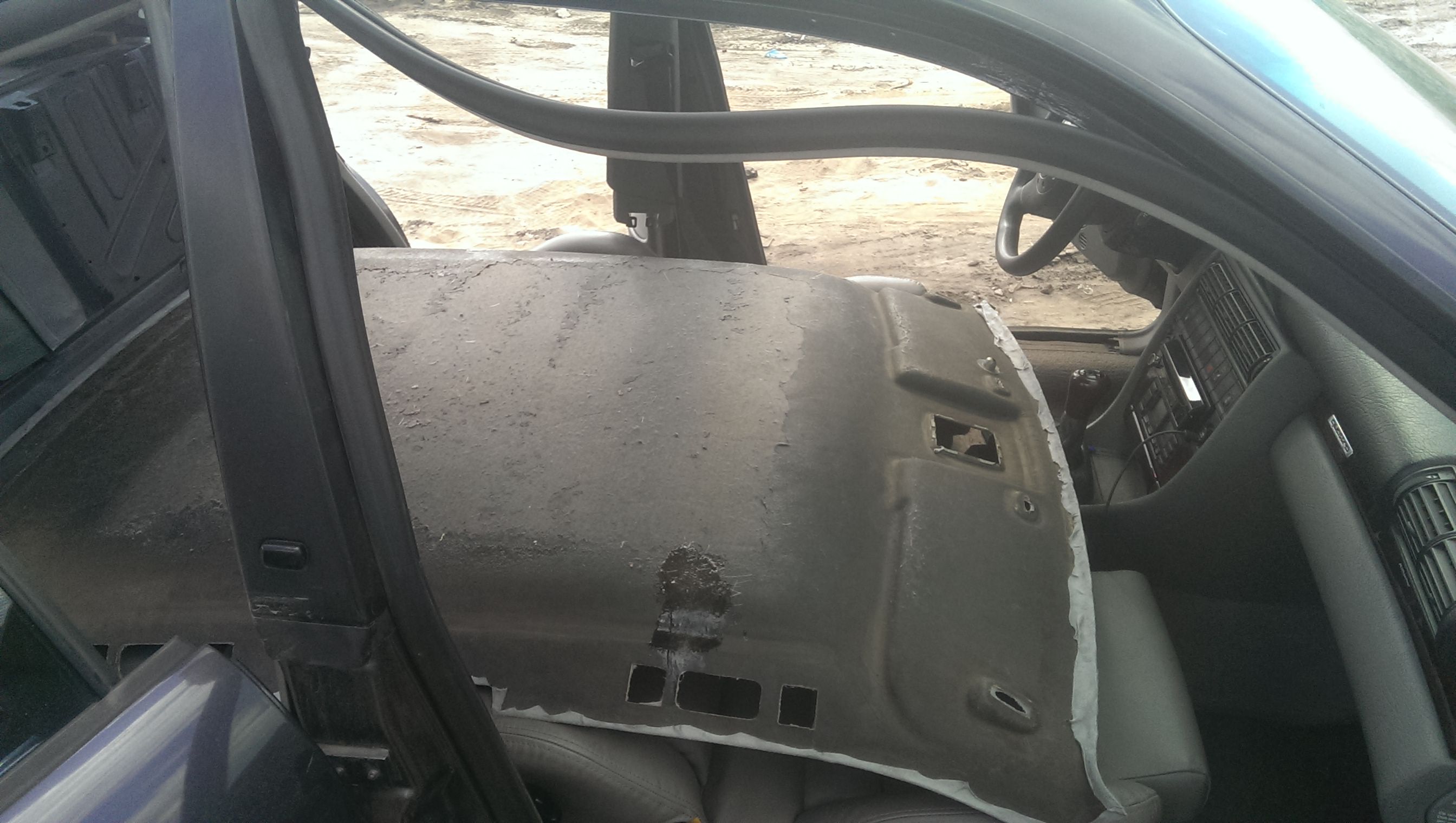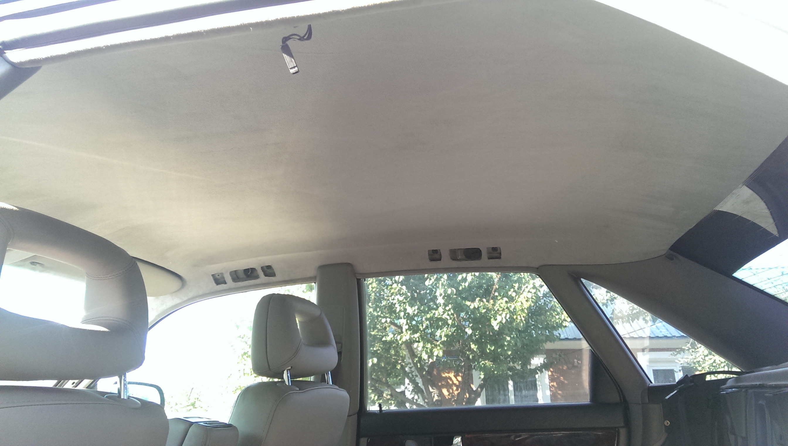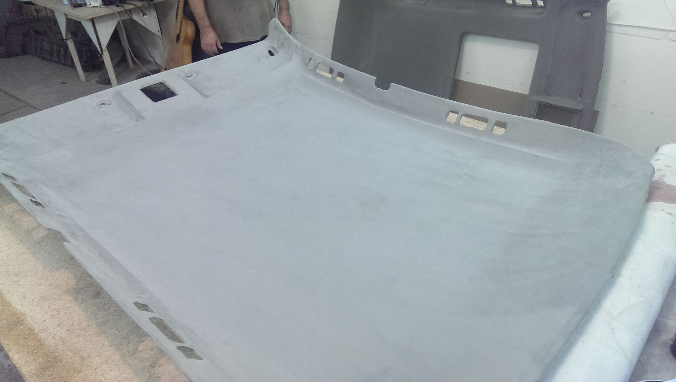 Обновил потолок, точнее обшивку потолка. На прошлой сходке пока многие катались на картингах,от нечего делать -потер потолок пеной для чистки салона. Результат дал о себе знать, хотя его уже чистил, но видно химия бывает разной. Со времянем он все обвисал, и это напрягало! Посмотрев как Саня RVSN перетянул потолок , решил выбрать алькантару. Но не тут то было, родной потолок не хотел отклеиваться(грел феном, брызгал растворителем) и был попросту порван! Снял на разборке с донора , за что отдельное спасибо Пашке AUDI_90. Повезло , что на доноре клей уже был сухой.