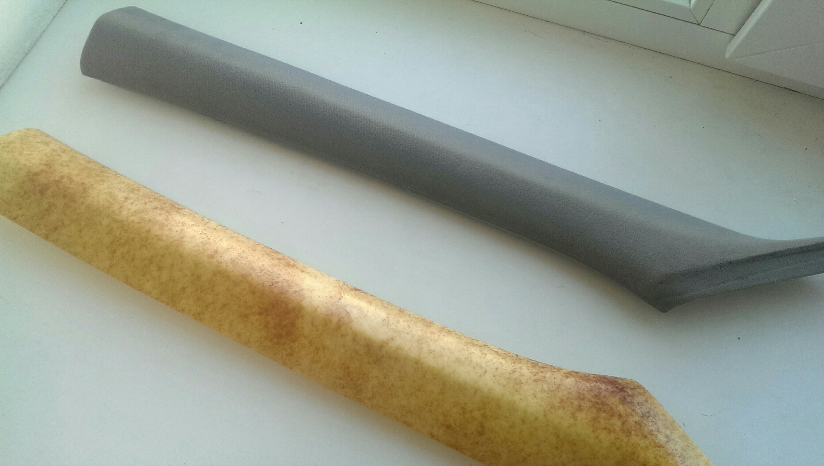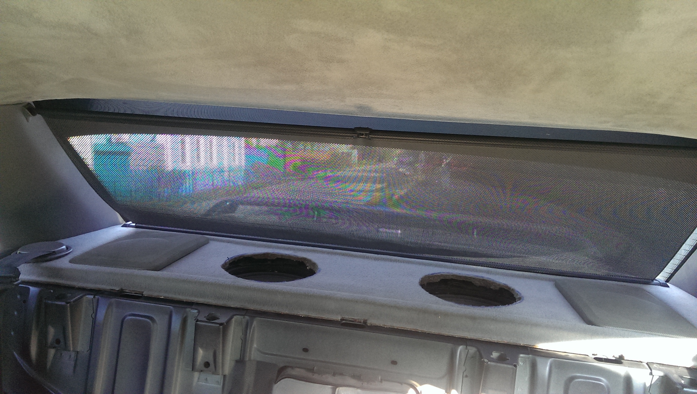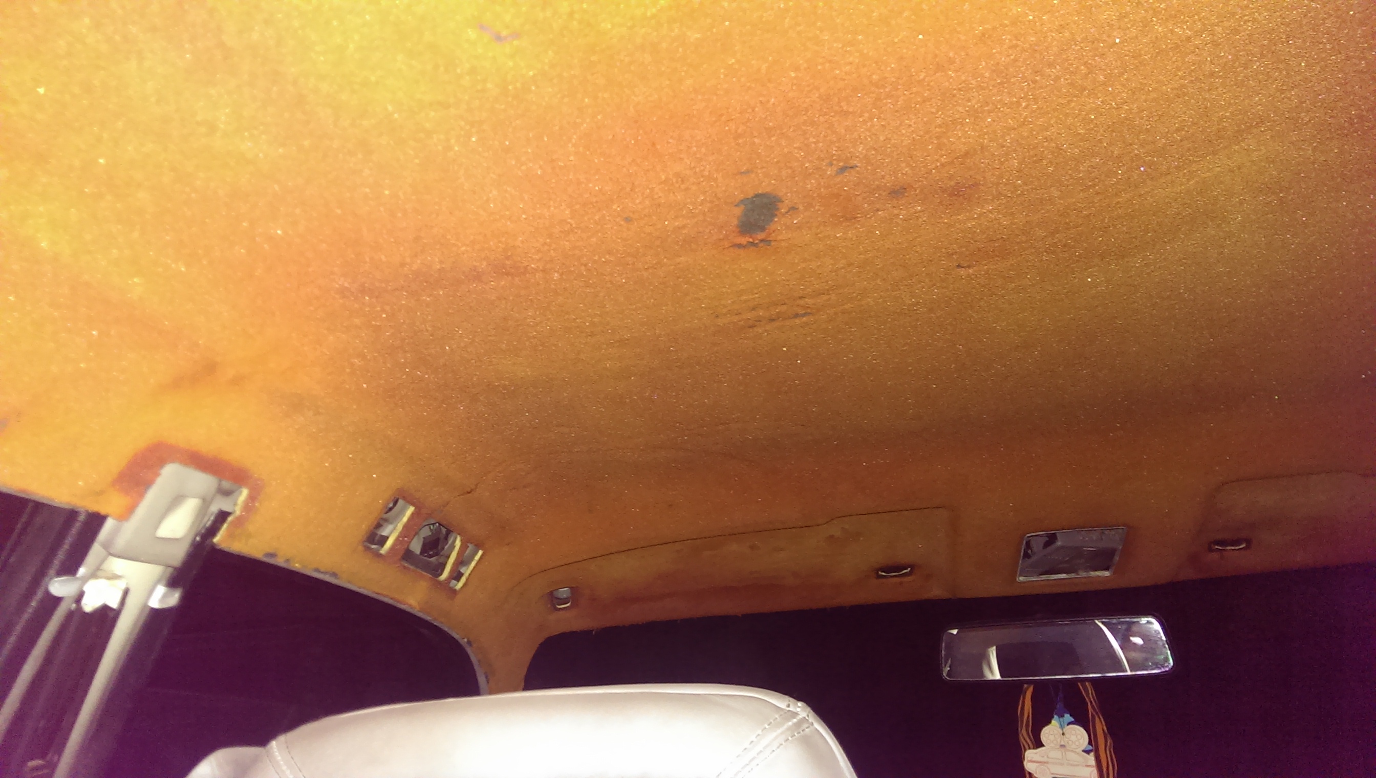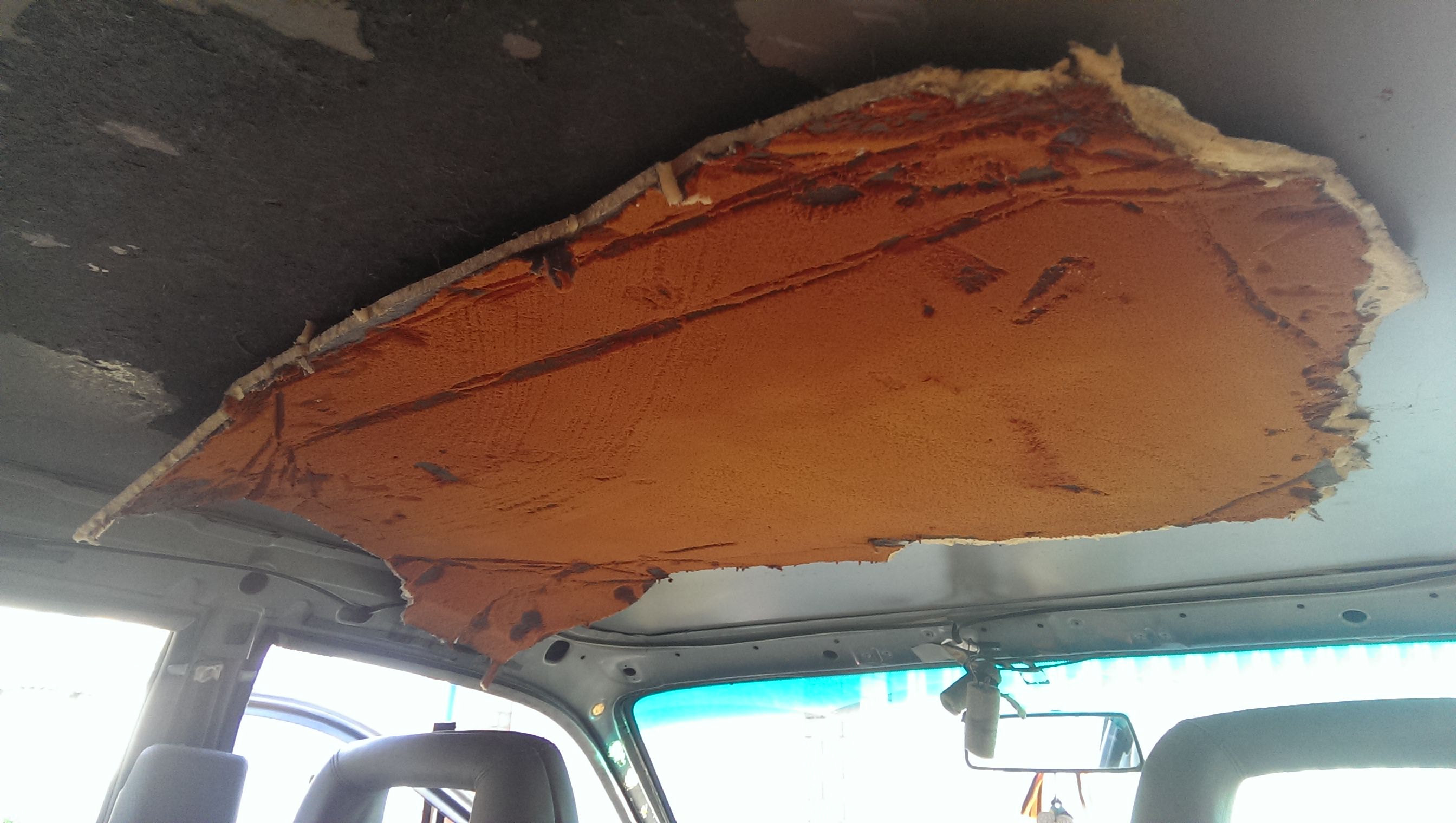Обновил потолок, точнее обшивку потолка. На прошлой сходке пока многие катались на картингах,от нечего делать -потер потолок пеной для чистки салона. Результат дал о себе знать, хотя его уже чистил, но видно химия бывает разной. Со времянем он все обвисал, и это напрягало! Посмотрев как Саня RVSN перетянул потолок , решил выбрать алькантару. Но не тут то было, родной потолок не хотел отклеиваться(грел феном, брызгал растворителем) и был попросту порван! Снял на разборке с донора , за что отдельное спасибо Пашке AUDI_90. Повезло , что на доноре клей уже был сухой.