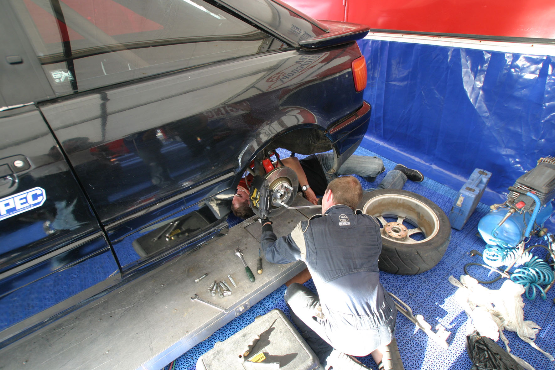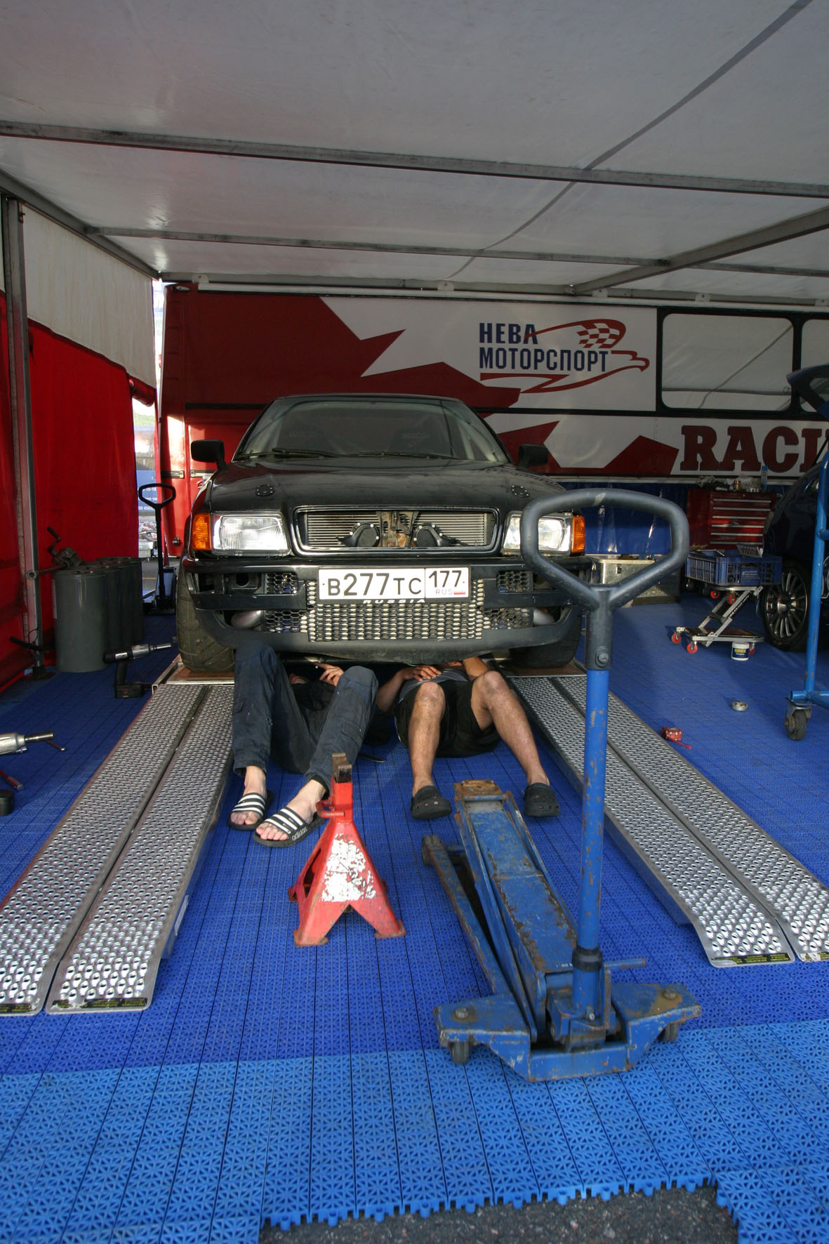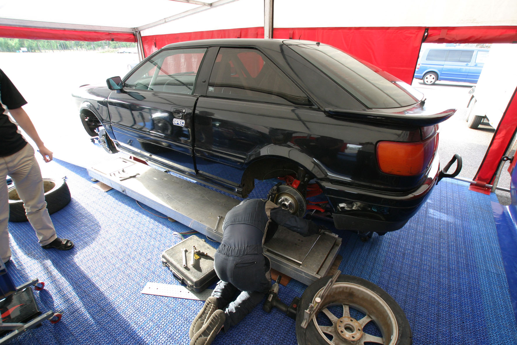 B4 купе черного цвета, каркас, 2 спорт ковша с 6т ремнями, S8 приборка, гидроручник, тормозилки - перед брембо от S8 с дисками 323мм зад от порш бокстера с дисками 300мм, коробка 6ст, сцепа не помню что но хорошая все держит, движок 2.8битурбо 660сил (фронтальный кулер, правильные насос, форсунки турбины) ну как положено вобщем. все компоненты движка - новые а не с разборок.