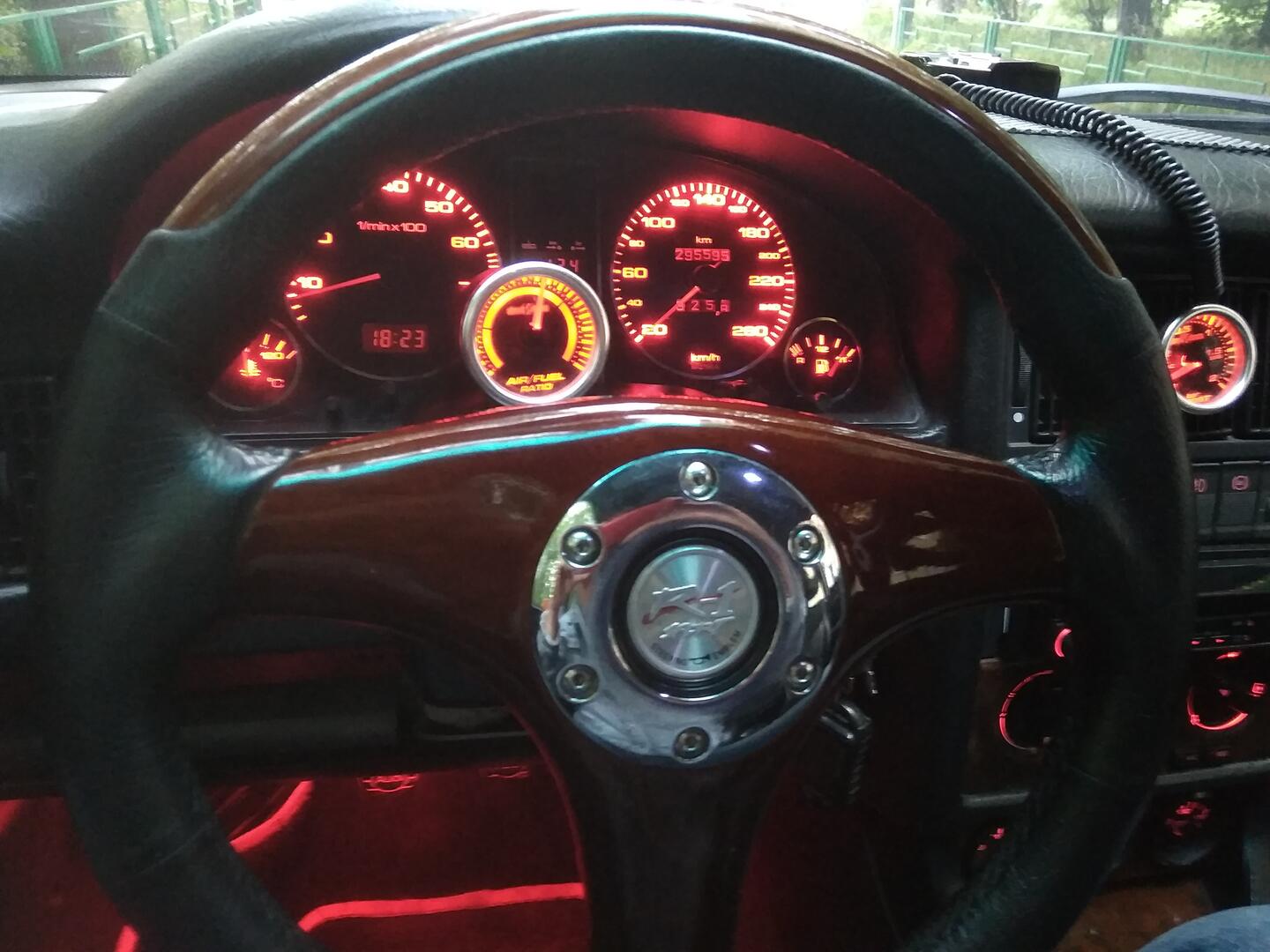 Руль тоже кожа/дерево. Нижняя подсветка в салоне. Приборная панель с мультичеком и БК.